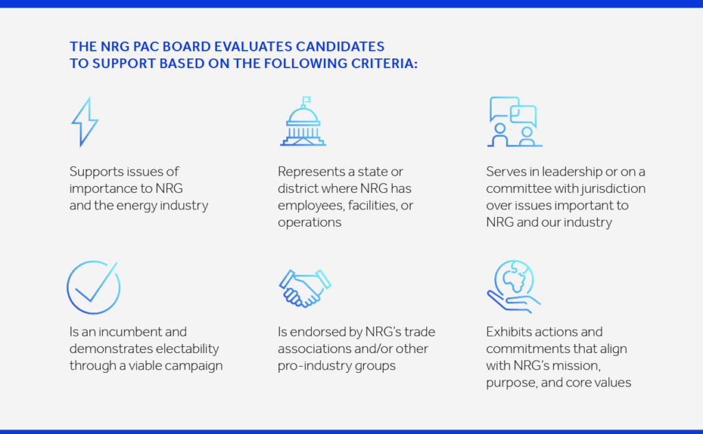 NRG PAC combines the voluntary contributions of individual employees and financially supports candidates running for federal, state, or local office. NRG PAC is nonpartisan and supports candidates who understand our position on key issues directly related to our business and industry. The NRG PAC Board evaluates candidates to support based on the following criteria: